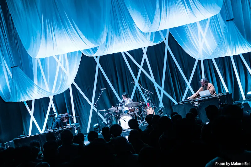 バッファロー・ドーターは、会場の音響的特性を考え抜いただろう、エンジニアzAk氏の活躍もあって、ロックの立体感を伴って登場した。しかし彼らのバンドは角銅と同じように、踊らせない。それでも、4つ打ちメインのシンプルなリズムが続く。いわゆるポストロックの複雑なリズムは全然見せないけれど、音色のセンスが研ぎ澄まされた20年前の曲が今も新鮮であることに、彼らの音楽の持つ芯の強さを見た思いになり、サム・アミドンはルーツ音楽を探っているが、個人的に前から影響を受けてきた彼らも実はルーツを持った音楽なんだな、という不思議な感慨に耽った。