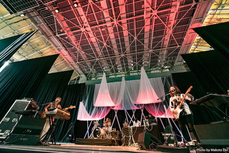 2日目は、大きな会場では初めて体験した角銅真実。フェスでも冒頭からリズムの反復に頼らずに音を聞かせる、というエクスペリメンタルポップの美学が徹底されていたようで、サム・アミドンのゲスト出演曲以外、グルーヴで安易にノせないのが印象的だった。例えばファンには耳馴染みのあるだろう「December 13」や「寄り道」なども、自在に拍子のアレンジを施した上で、さらりと自然体で歌う。根底には、ピアノでワルツを弾いても感じられた抜群のリズム感覚と、アコーディオンや声などを使ったアトモスフェリックなテクスチャーの共存があった。マリンバを叩いても、囁くような歌声や吐息を発しても、精緻に彫刻された空気の波が美しく迫ってくるような感覚があって、自然に会場の耳は誘導され集中してしまう。そこには鮮烈な清々しさがあった。