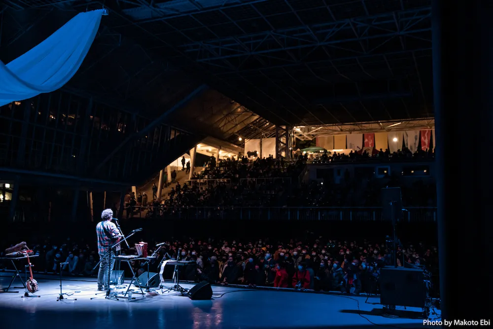 「予想外」といえば、2021年の「ある流れ」ほどその言葉を色濃く象徴するものはないだろう。とっかかりを作ったのは1日目に出演したサム・アミドン。時折演奏のなかで、観客に合いの手としてあるフレーズを歌うよう促し、ホール全体が音楽の一部となる時間を作った。