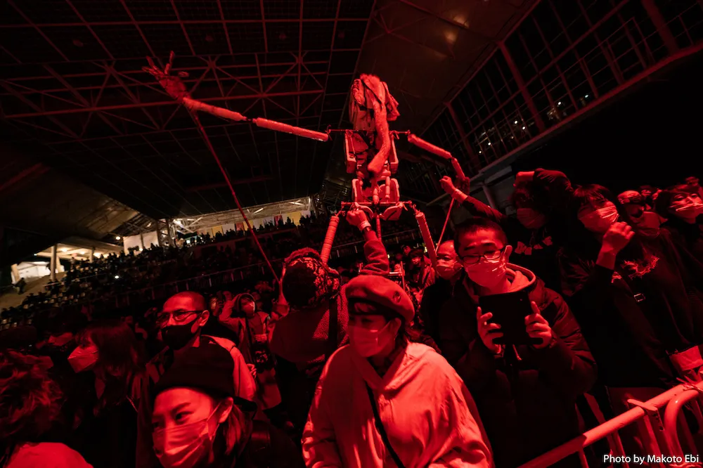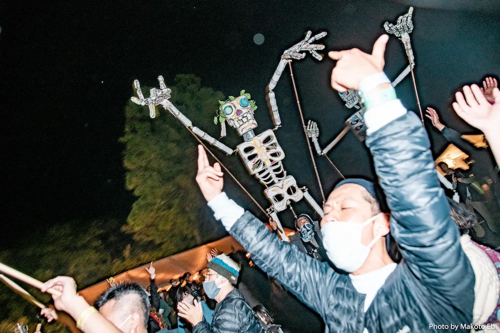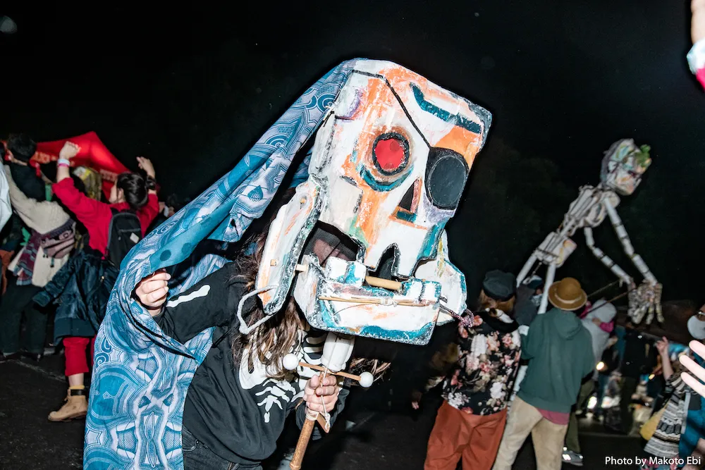 強弱の質感が一体となった観客らがパフォーマンス終了後にホールを後にし、方々へ散りゆく流れのさなかに突如現れたサンバチーム、ブロッコ・シズオカ。頭上を切り抜ける笛の高音と内臓にずしんと伝わる太鼓が刻むサンバビート、そして全長3メートルはあるガイコツの人形を携えたパフォーマーたちの周りにいる人々は、サンバを踊ったことがなくてもそのリズムに身体を巻き込まれ動きを引き出されていく。飲食屋台の前方にいたパフォーマーらと観客たちは、そのまま坂を上がりエントランスの手前にあるマーケットエリアへ、何か大きなものにみるみる引き込まれていくように進んでいった。
